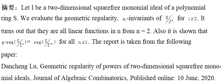 报告题目:Geometric regularity of powers of two-dimensional squarefree monomial ideals