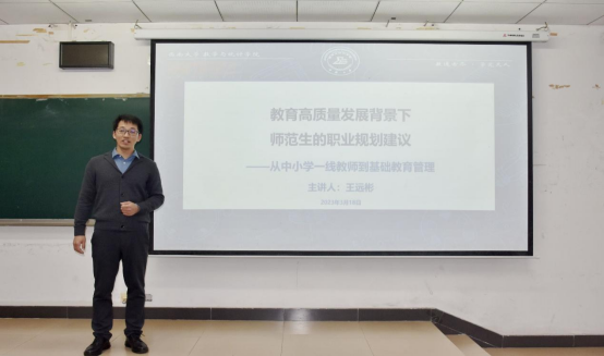 为推进师范生生涯规划教育,引导师范生树立正确的学习观,明确奋斗目标,找准发展方向,激发师范生向四有好老师努力奋进,3月18日上午十点,学院邀请了99级优秀院友,中学数学高级教师,中考命题专家,成都天府新区四中副校长,全国初中数学青年教师优质课比赛、全国高中数学赛课一等奖获得者王远彬老师为本科一年级学生开展“教育高质量发展背景下师范生的职业规划建议——从中小学一线教师到基础教育管理的视野和心得”专题讲座。