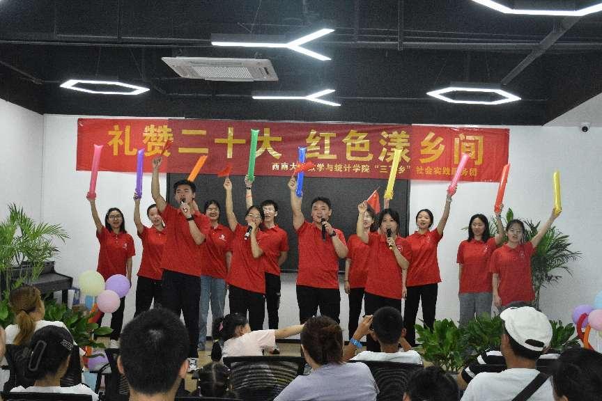 九龙坡区白市驿镇有着丰富的红色文化历史资源。以此为契机,社会实践服务团成员前往白市驿镇革命烈士纪念碑缅怀革命先烈,回顾历史,共同学习英雄事迹,重温入党、入团誓词。社会实践服务团成员还走访了白市驿镇的一些老党员,听老党员们讲述着的党史故事,感受他们的入党初心。随后,社会实践服务团来到白市驿党群服务中心,隆重举办“礼赞二十大,红色漾乡间”文艺汇演,与当地民众共唱革命歌曲、共话党史,活动反响热烈。