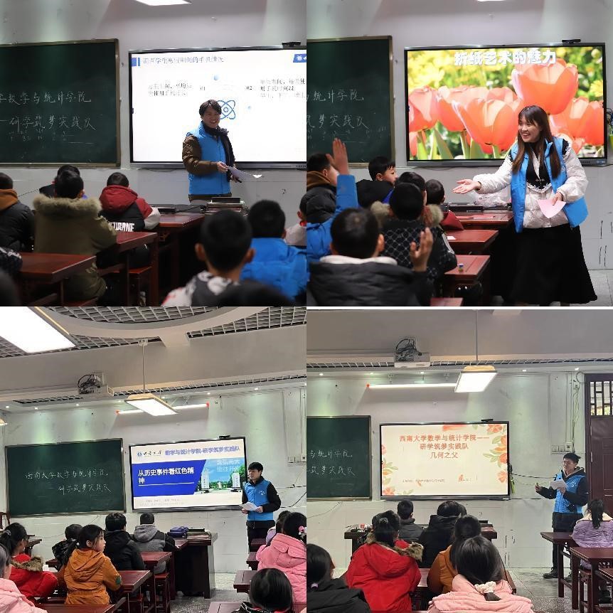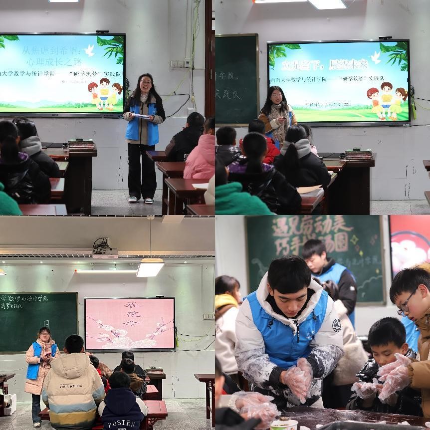 针对咸宜小学留守儿童较多、春节收假收心等学生情况和教学需求,实践队设计了以分离焦虑应对、不做“手机控”、成长梦想等为主题的9节特色实践课程。课程不仅涵盖人文教育、情感教育、劳动教育、心理帮扶、学业规划等内容,还结合学院特色和地方特色,对数学思维和文化、城口红色历史进行了介绍,为同学们带去了有趣、有益的学习体验。