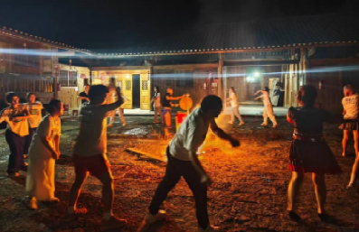 实践团队向非遗传承人顾昌福学习原始摆手舞,一招一式尽显土家文化厚重底蕴。当夜幕降临,篝火熊熊燃起,队员们与村民共跳摆手舞,古老韵律与现代欢笑交织,照亮了光明村的夜晚。