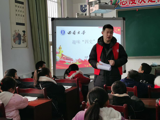 为深入学习贯彻习近平总书记的讲话精神,在437必赢会员中心党委的精心安排与指导下,19级研究生第一第二党支部部分成员于2020年1月18日来到了重庆市江津区四合村中山镇小学,于多个班级开展了“数暖童心,与梦同行——‘四史’趣味课堂”活动,由党员同志为小朋友们讲述烈士们的英勇事迹。一方面旨在教育党员同志进行自主且深入的学习党史,另一方面旨在让小朋友在共情共鸣中厚植爱国主义情怀。