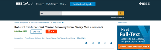近日,我院王建军教授团队在人工智能领域——高维数据挖掘与机器学习方面再次取得突破性进展,以“Robust Low-tubal-rank Tensor Recovery from Binary Measurements(基于二值测量的稳健低管秩张量恢复)”为题的研究论文被国际权威顶级期刊IEEE Transactions on Pattern Analysis and Machine Intelligence(IEEE TPAMI,IF:17.861)(《IEEE模式分析与机器智能汇刊》)录用为长文(Regular Paper)并已在线发表。IEEE TPAMI是人工智能、模式识别、计算机视觉及机器学习领域国际最顶级期刊,是中国计算机学会(CCF)推荐的为数不多的人工智能领域A类期刊。437bwin必赢国际为成果的第一完成单位及第一通讯作者单位,我院博士研究生侯景耀为该论文的第一作者,王建军教授为通讯作者。这也是王建军教授团队近两年内在IEEE TPAMI上发表的第二篇高水平研究论文。