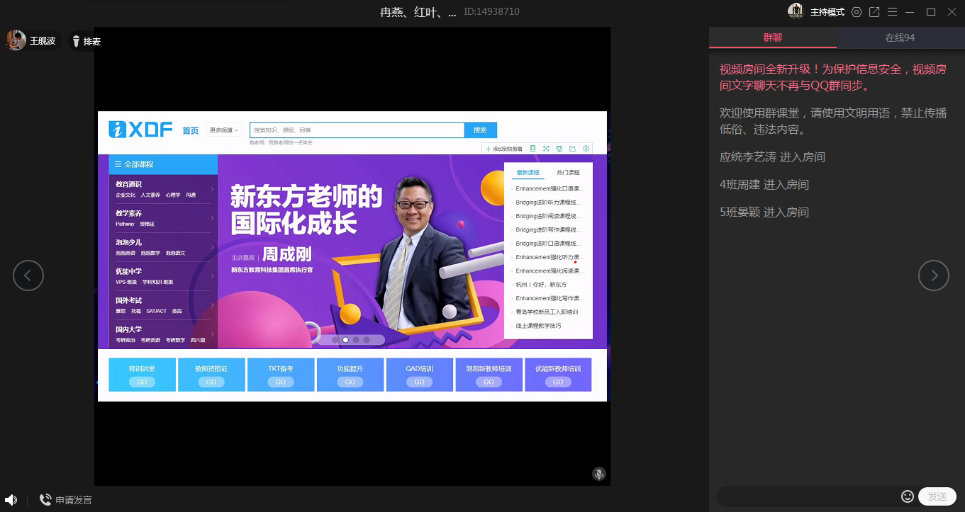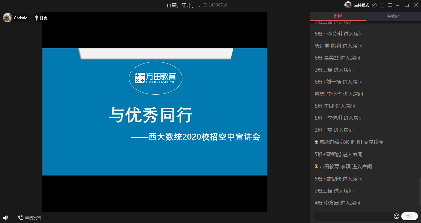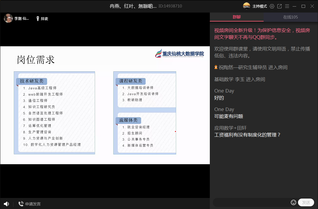 双选会于下午1点整正式开始,共有黄冈师范学院、巴川中学、重庆仙桃大数据学院、重庆新东方公司等9家用人单位和一百余名本科生、研究生参会,用人分别通过直播、PPT介绍、在线答疑等方式进行了招聘宣讲,数统院2020届毕业生辅导员唐海、祝陶然为用人单位详细介绍了学院的各方面情况,各毕业生就自己关心的问题进行了咨询提问,双选会网络会场氛围热烈、互动积极。