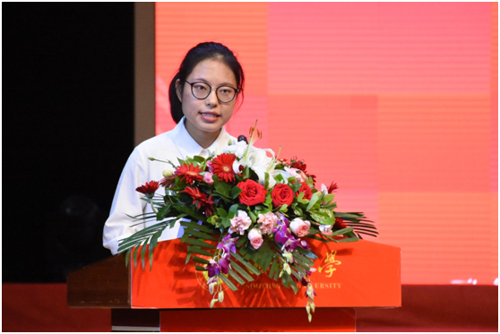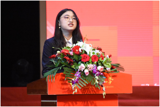 典礼在全体师生的国歌声中拉开帷幕。首先,高年级学生代表2018级本科生黄钰涵同学表达了对2020级新生的欢迎,并从学习、生活、工作等多方面向2020级新生分享经验,寄语新生“绽放青春风采”,表达了她对新生美好的祝愿。