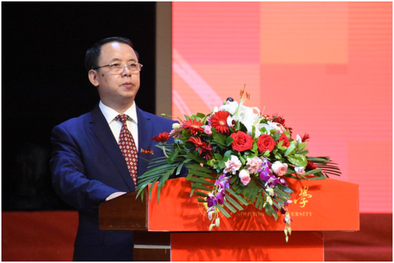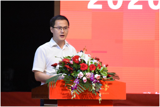 党委书记易遵尧为新生致辞,他代表学院向全体新生的到来表示热烈的欢迎。易书记向大家介绍了学院的发展历史,并从师资力量、学术、学生获奖等方面介绍了近几年学院取得的成绩。最后,易书记勉励同学们在大学期间要树立明确的人生目标,不断学习,充实自我,用好“加减乘除”法则,过好无悔青春,努力成为有理想、有本领、有担当的新时代奋进者。