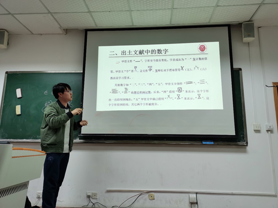 介绍出土文献中的数字。从算筹说起,郑老师一一为我们展示从“一”到“万”的数字在甲骨文中书写与表达方法,详细阐述每个数字的最初来源。让大多数数学系的学生第一次了解与我们生活学习最紧密的数字的最原始形象与意义。