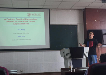 接下来王尧副教授进行了题为“A Fast and Practical Randomized Method for Low-Rank Tensor Approximations”的学术报告。王尧老师首先介绍了张量建模在视频监控、高光谱图像融合和快速核磁共振成像等领域的应用背景。然后结合他们团队近期的实验结果指出现有的张量分解策略,例如Tucker分解、高阶奇异值分解和张量奇异值分解具有计算速度慢、计算代价高等缺点。为了克服这一难题,王尧副教授团队基于著名的Johnson-Lindenstrauss引理,将随机投影和URV思想结合提出了一种新的张量分解方法r-URV,极大地提高了张量分解的速度,同时获得了张量分解误差的期望界,为张量建模方法的进一步应用奠定了基础。