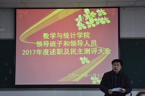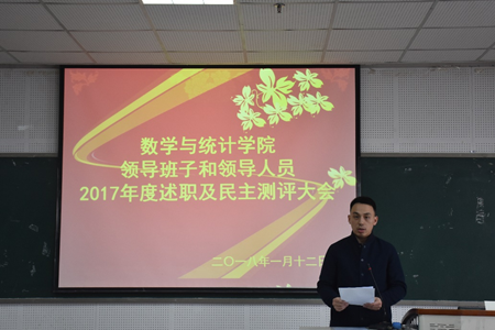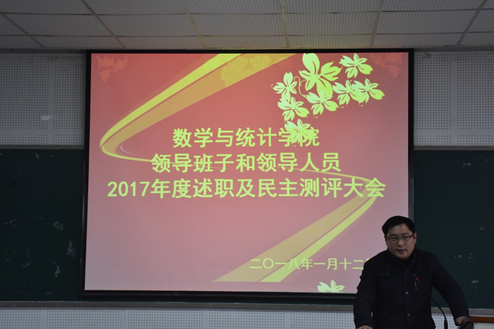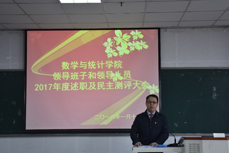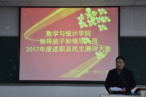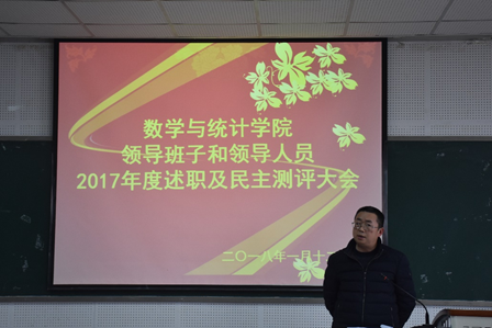为加强中层领导班子建设和干部队伍管理监督,按照学校《关于做好中层领导班子和领导人员2017年度考核工作的通知》等有关要求,2018年1月12日下午,437必赢会员中心在25教14楼学术报告厅召开全体教职工大会,总结2017年工作,对领导班子和领导人员进行年度考核。教职工听取了学院领导班子年度工作总结和领导人员个人述职报告,并就学院及领导干部一年来的工作情况进行了民主测评。会议由党委书记易遵尧主持。