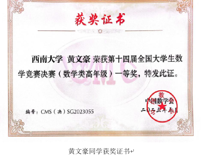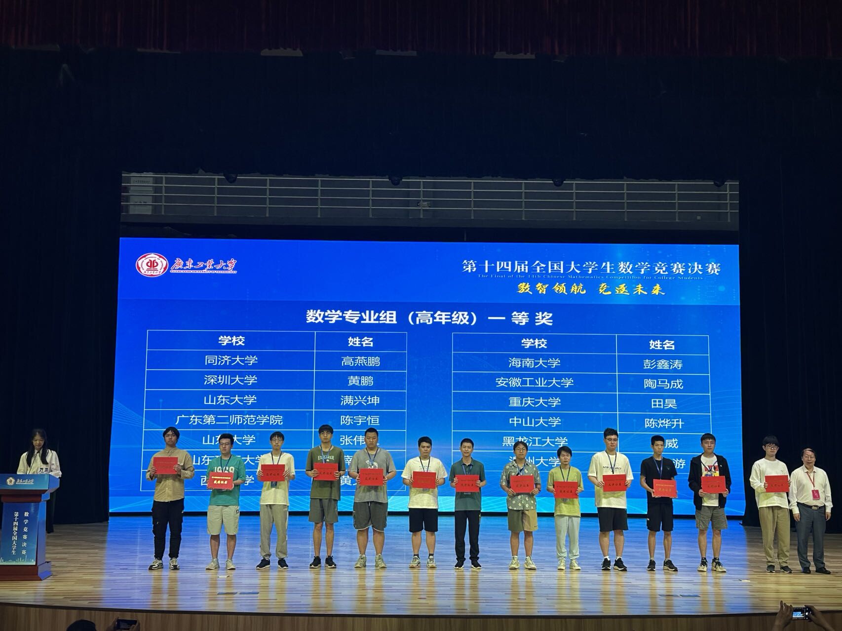 全国大学生数学竞赛是由中国数学会主办、面向本科生的全国性高水平学科竞赛,对促进高校提升人才培养质量、深化数学课程建设与教学改革、发现和选拔数学创新人才发挥着至关重要的作用,也为青年学子提供了展示数学素养的平台。第十四届全国大学生数学竞赛分为初赛和决赛两阶段进行,决赛于5月在广东工业大学举行,共有来自全国32个赛区的922位同学入围。437bwin必赢国际共6名同学入围全国总决赛,其中我院就有4名学生代表重庆赛区参加数学类高年级决赛。经过激烈角逐,最终斩获1个一等奖、3个三等奖的好成绩。