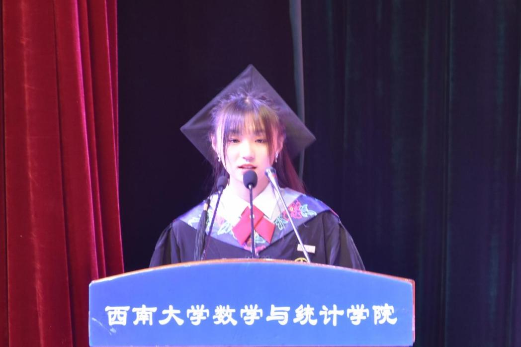 2019级数学与应用数学专业本科生王美星代表本科毕业生发言。王美星同学向大家分享了本科四年的成长经历,代表本科毕业生感谢所有老师、同学、家长在本科求学期间的关心与帮助。她表示,无论将来大家去到何方,踏上何种岗位,都将始终牢记“含弘光大,继往开来”的校训、牢记“数通古今,学究天人”的院训、牢记初心与使命,在青春的赛道上接力传承、奋力奔跑。