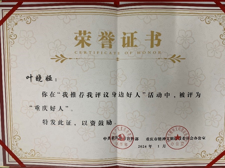 2023年第四季度“重庆好人榜”,经重庆市各区县推荐、资格审核、综合评定,全市32万名网友的推荐、点赞和评论,叶晓娅老师以其助人为乐的持续、深入获得网友的积极支持,在91名候选人中脱颖而出,由中共重庆市委宣传部、重庆市文明办评选为2023年第四季度“重庆好人”20人(组),最终入选“重庆好人榜”。叶老师的善行善举对学院师生起到了良好的榜样带动作用,更为新学期注入了昂扬向善的振奋力量。