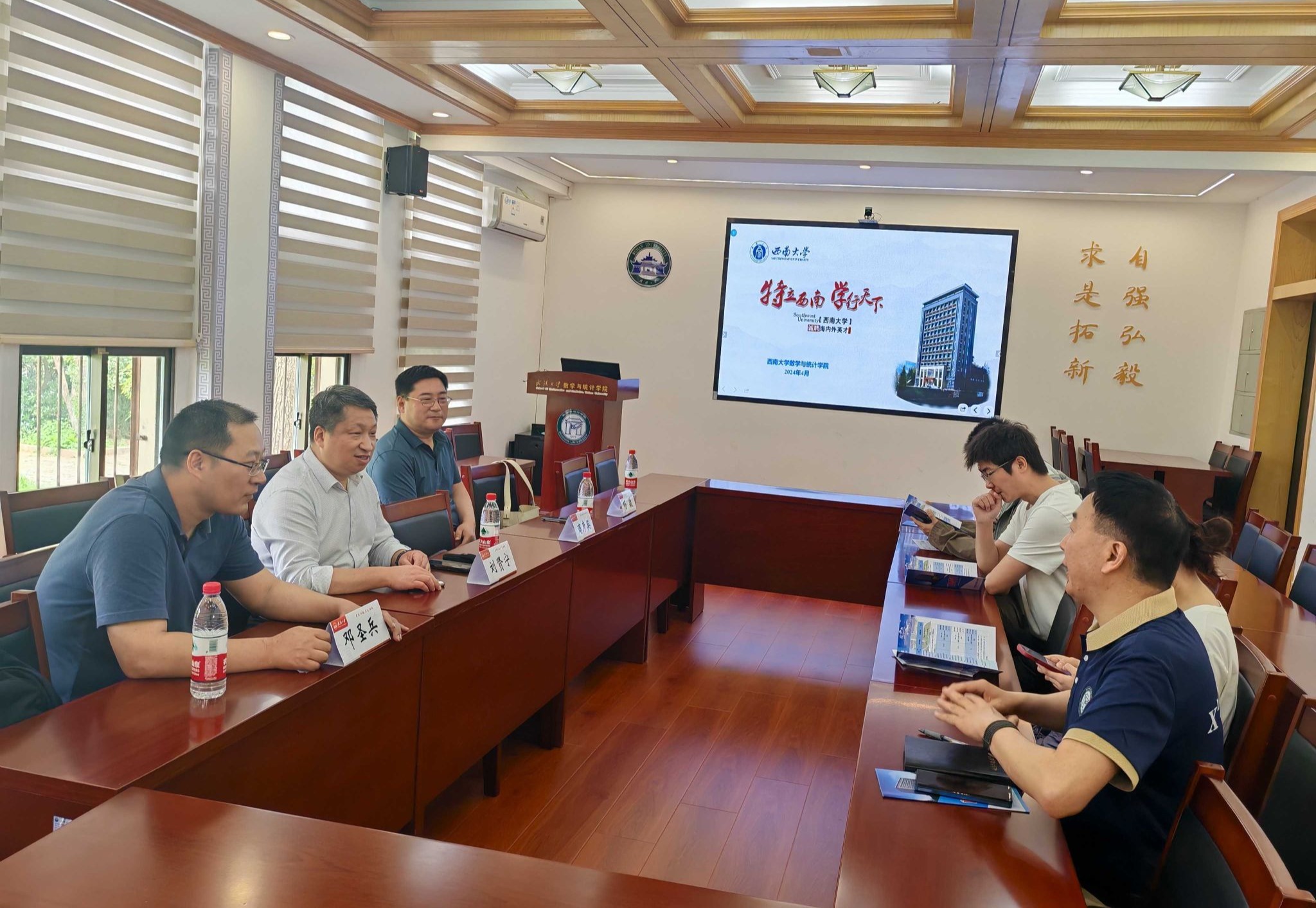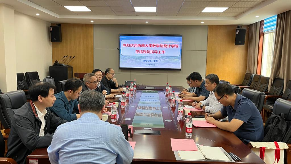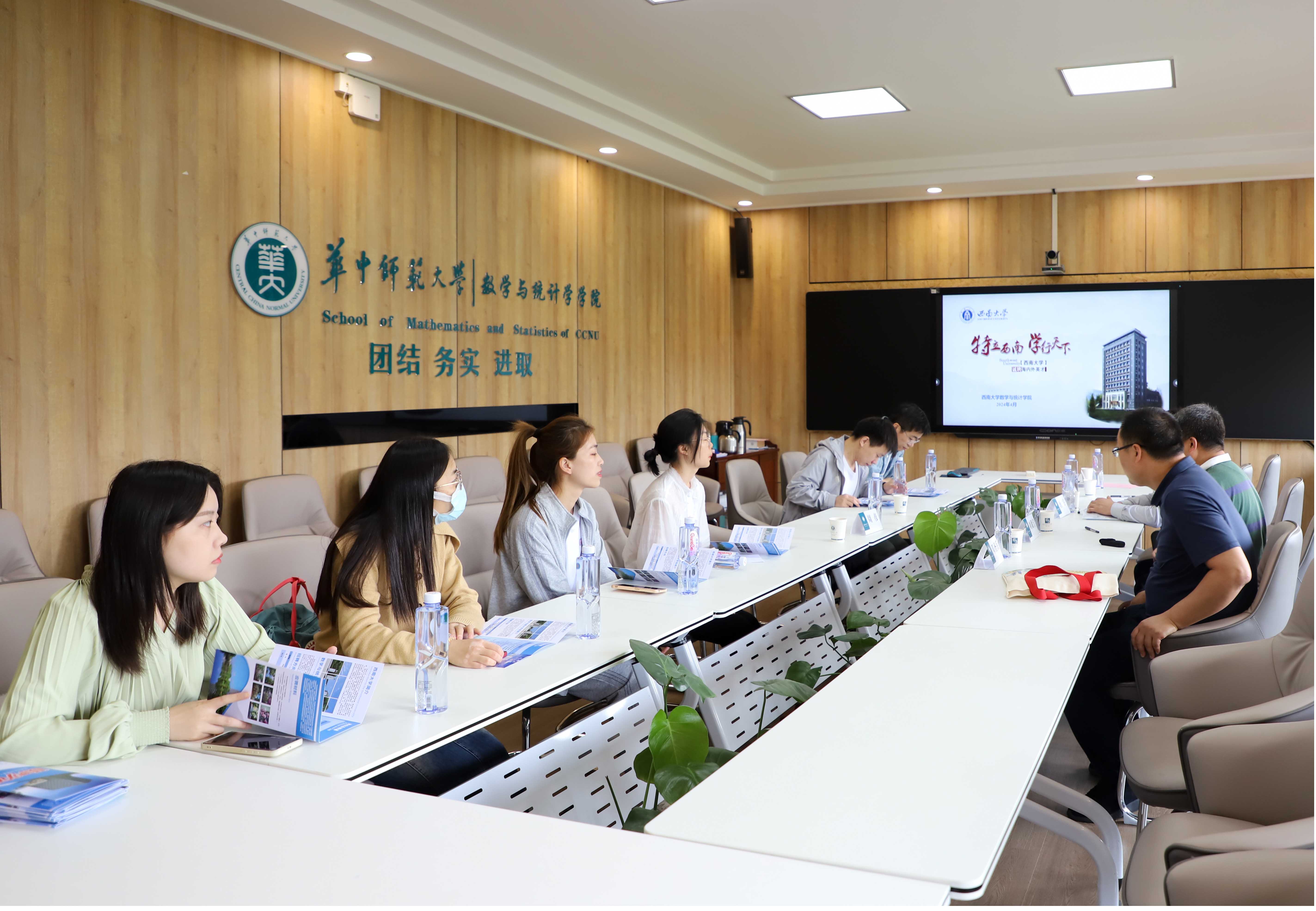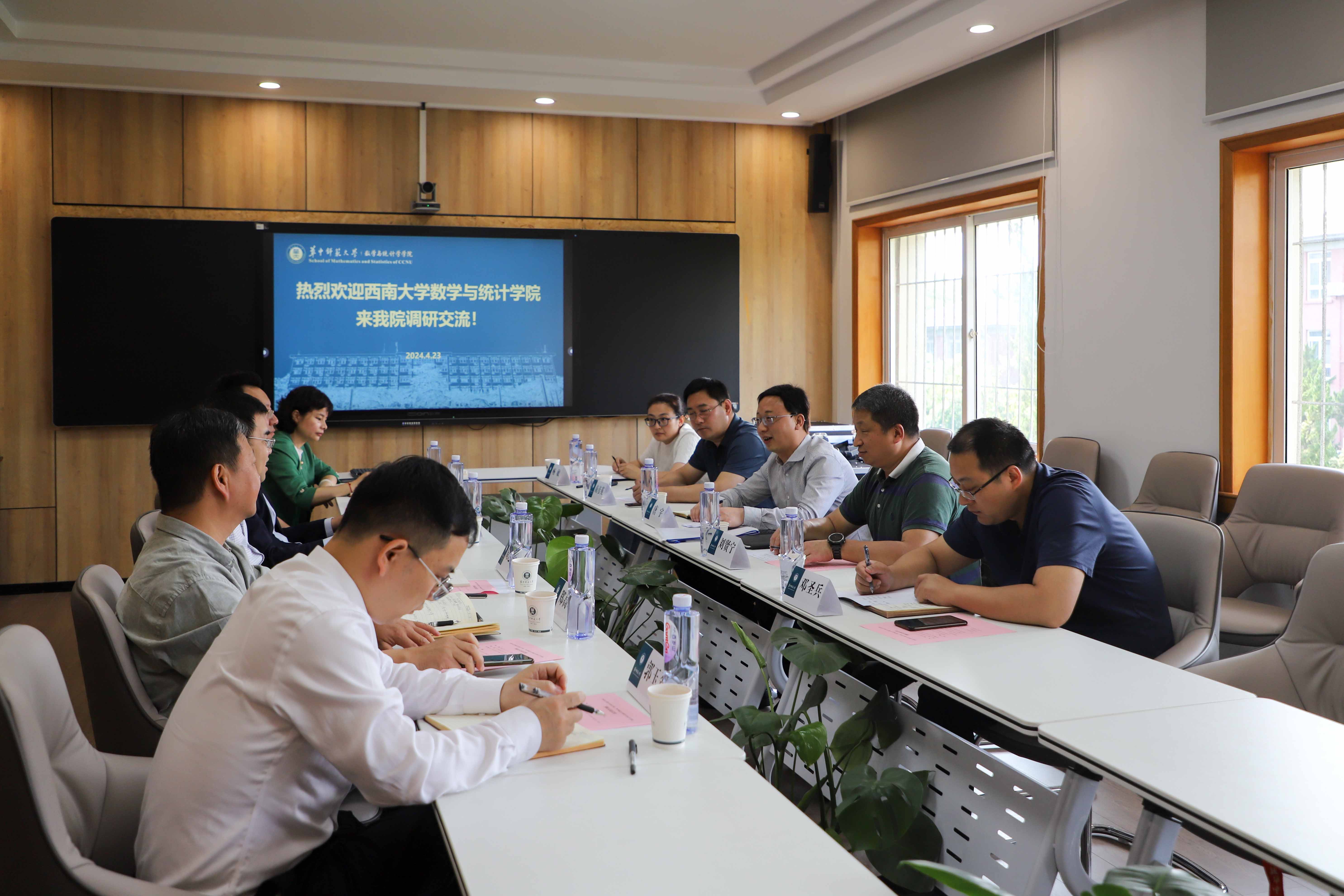 23日上午,学院班子成员接着到华中师范大学数学与统计学学院调研。华中师范大学数学与统计学学院党委副书记周彦主持调研座谈会,院长周远扬致欢迎辞并介绍华中师范大学数学与统计学学院相关情况,详细介绍了学院近几年来“双一流”建设、中心平台建设、课程建设、人才队伍建设等取得的发展成果。副院长郑高峰介绍了教学信息化建设、师范生培养特色、统计学“1+N”课堂教学模式等情况,副院长左国新介绍了本科生招生和研究生培养情况,副院长郭玉劲分享了人才培育与国际学术交流的做法和经验。