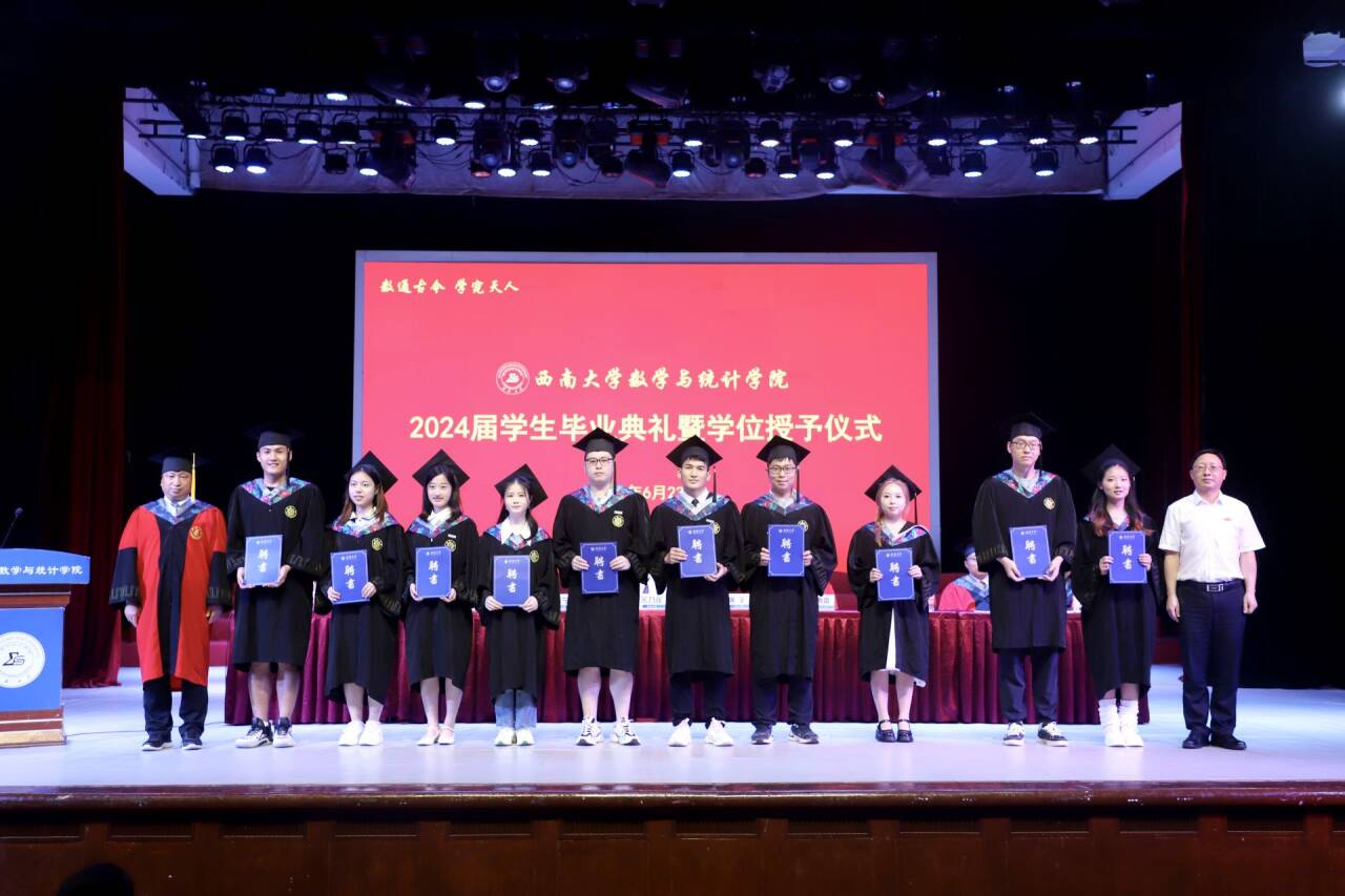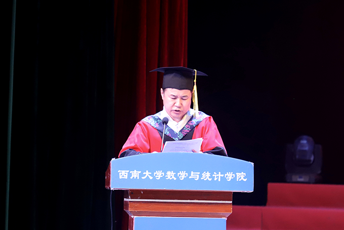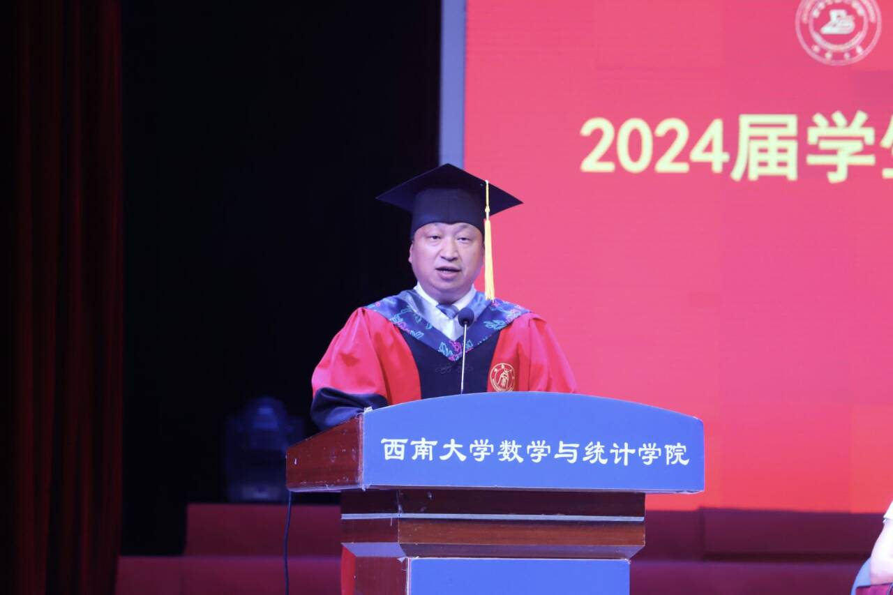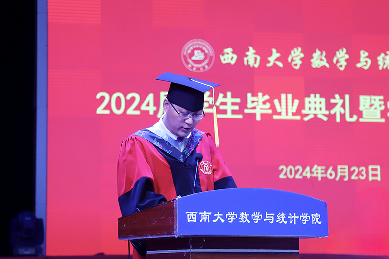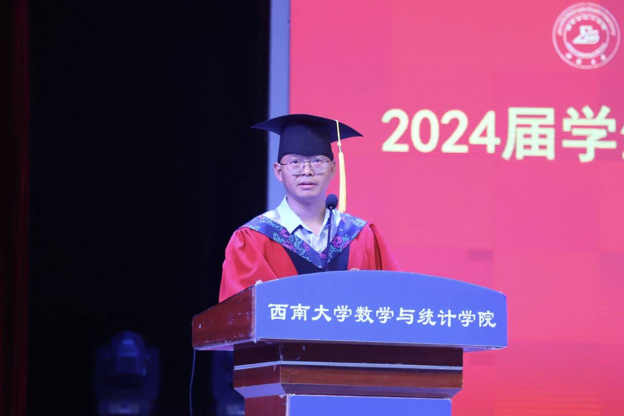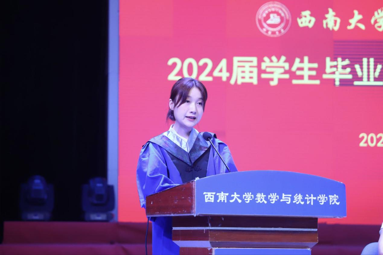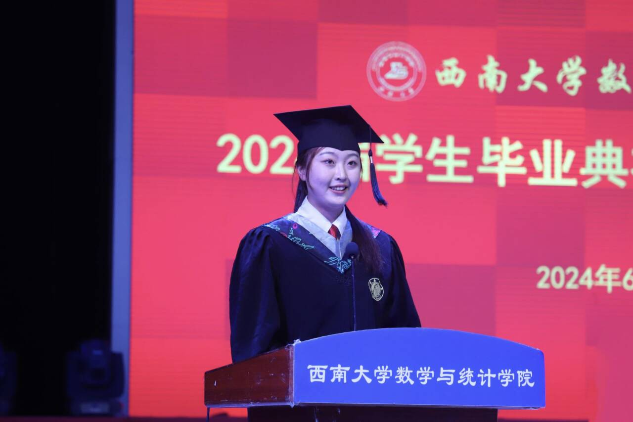 2020级数学与应用数学师范专业本科生李婉昕代表本科毕业生发言。她回忆了四年来专业学习的点点滴滴,体会学习数学要有坚持不懈的毅力和团结协作的能力。表示会牢记“含弘光大、继往开来”的校训,无论未来在何岗位,始终都与祖国同行,做怀抱梦想又脚踏实地、敢想敢为又善作善为的西大人。