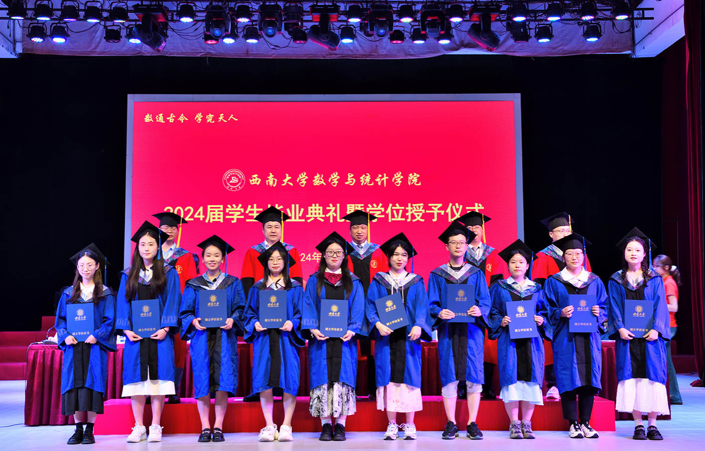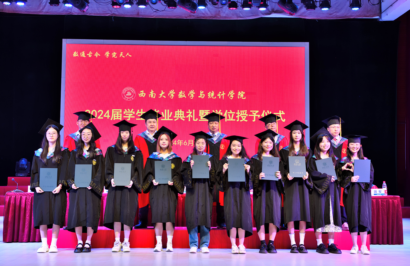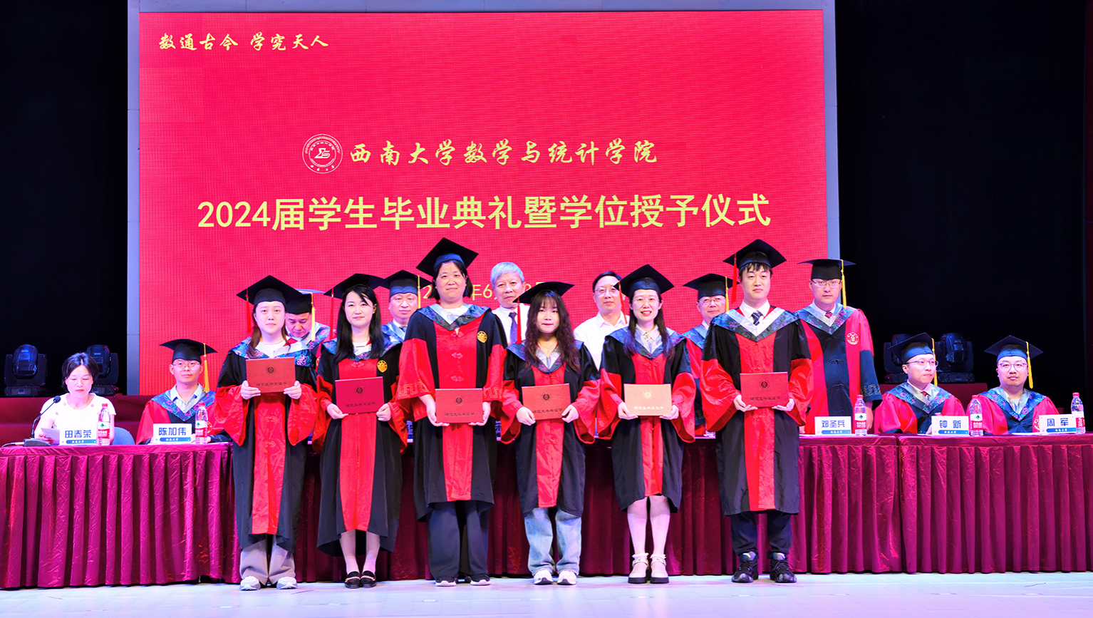 在热烈昂扬的音乐声中,主席台上的领导老师们为优秀毕业生代表颁发荣誉证书,为在场所有毕业生颁发毕业证书,学院学术委员会委员为毕业生颁发学位证书并拨穗授位。